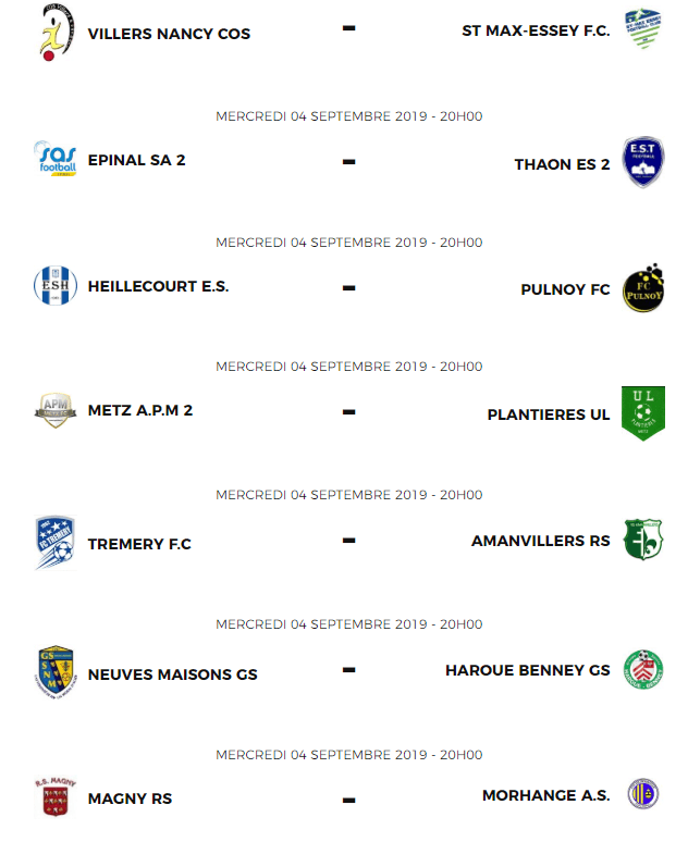 Haroué et Neuves maisons qui ont bien débutés leur championnat s’affrontent pour atteindre la barre 7 points en 3 matchs. Les deux réserves vosgiennes s’affrontent également ce mercredi. Enfin un beau petit match entre outisders dans ce groupe entre Heillecourt et Pulnoy.