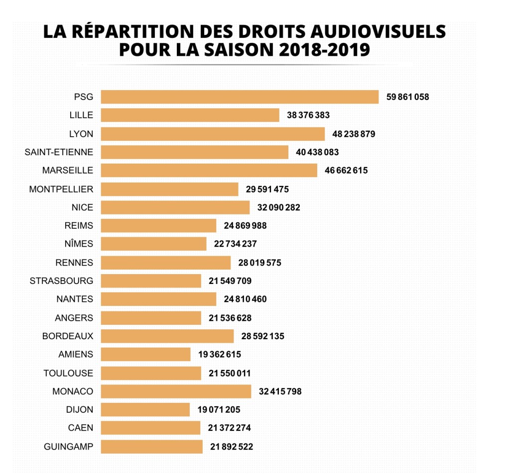 Comme on peut le voir sur cette répartition des droits TV de la saison 2018-2019 en Ligue 1 il existe des différences parfois importants d’une place à l’autre. Ce coefficient de répartition est calculé avec une base fixe : la place au classement final, et » notoriété » du club. L’anomalie de l’année dernière était clairement l’AS Monaco.