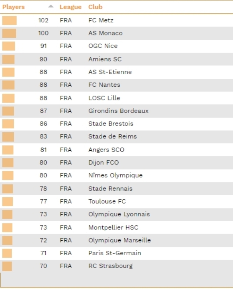 Le site de chiffres et de statistiques CIES Football Observatory vient de publier un tableau des 20 équipes de Ligue 1 de cette saison. Celui-ci démontre le nombre de joueurs utilisés par chaque formation depuis janvier 2015.
